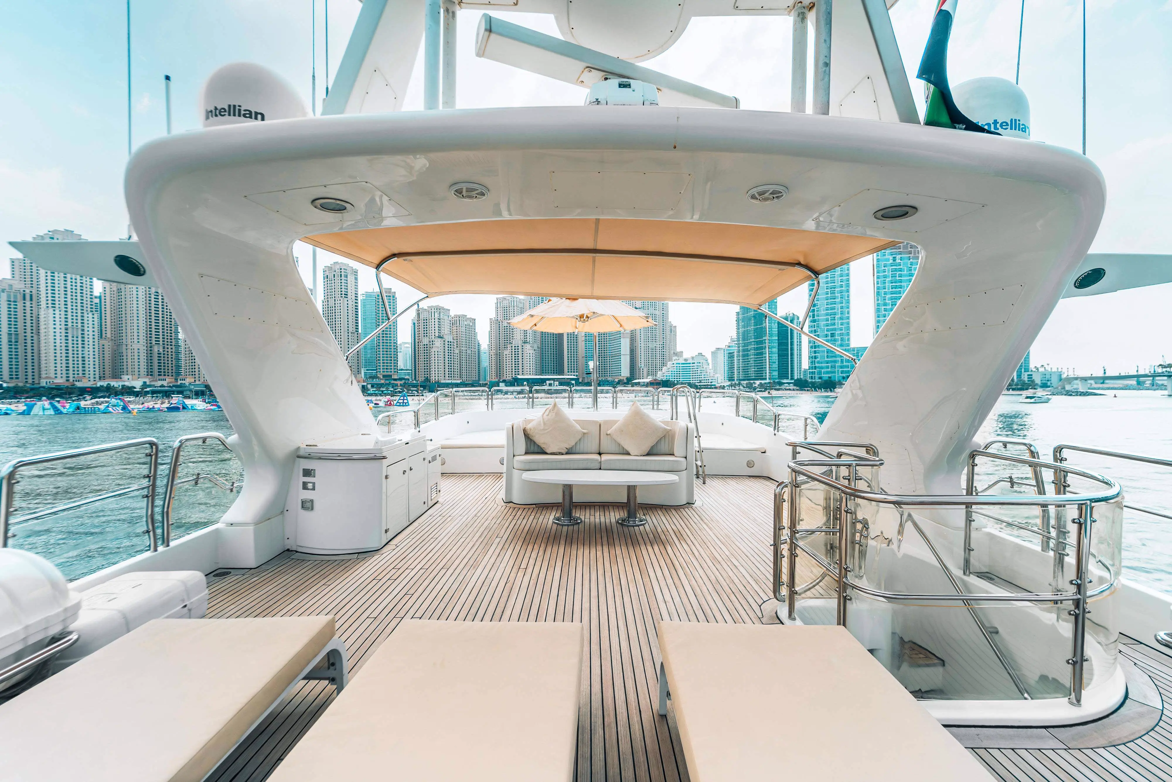 - Expansive Flybridge: Shaded lounge area with bar setup and sunbeds—ideal for parties or relaxation