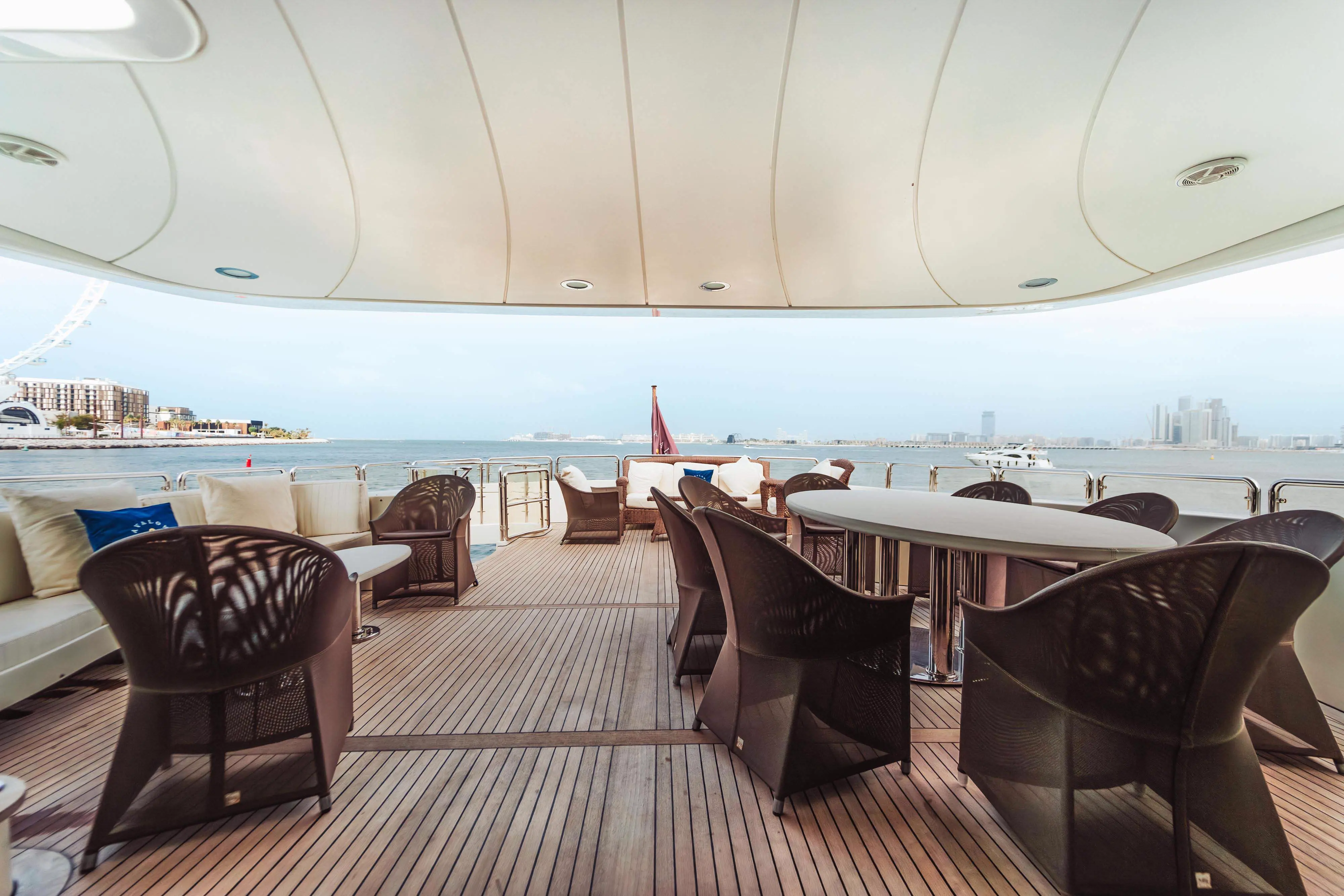 - Aft Dining Area: Elegant outdoor dining space with teak finishes for sunset dinners or cocktail hours